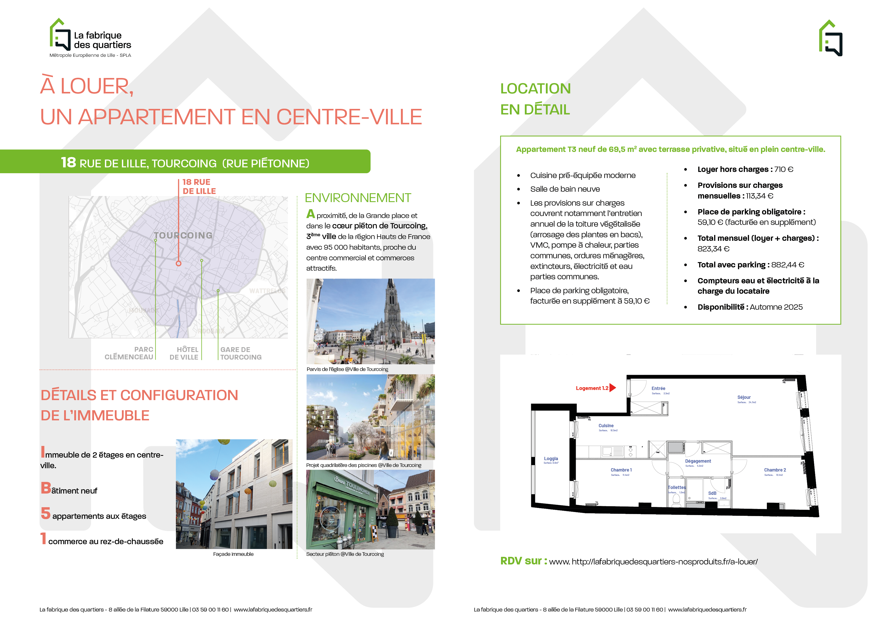 Au 18 rue de Lille, au cœur du centre-ville de Tourcoing, La fabrique des quartiers vous propose à la location un appartement T3 neuf de 69,5 m², avec terrasse privative, qui répond aux normes de performances énergétiques de la RE 2025.